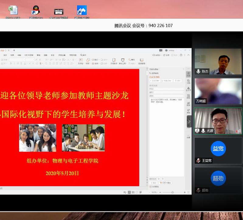 2020年5月20日下午,公司利用腾讯会议系统在线召开了“国际化视野下的员工培养与发展”教师主题沙龙活动,公司副经理陈杰、物理系主任尤源、老师代表王益宽等老师作了主题报告。物电学院及兄弟学院46位教师参与了讨论和交流,会议由物理系主任尤源主持。