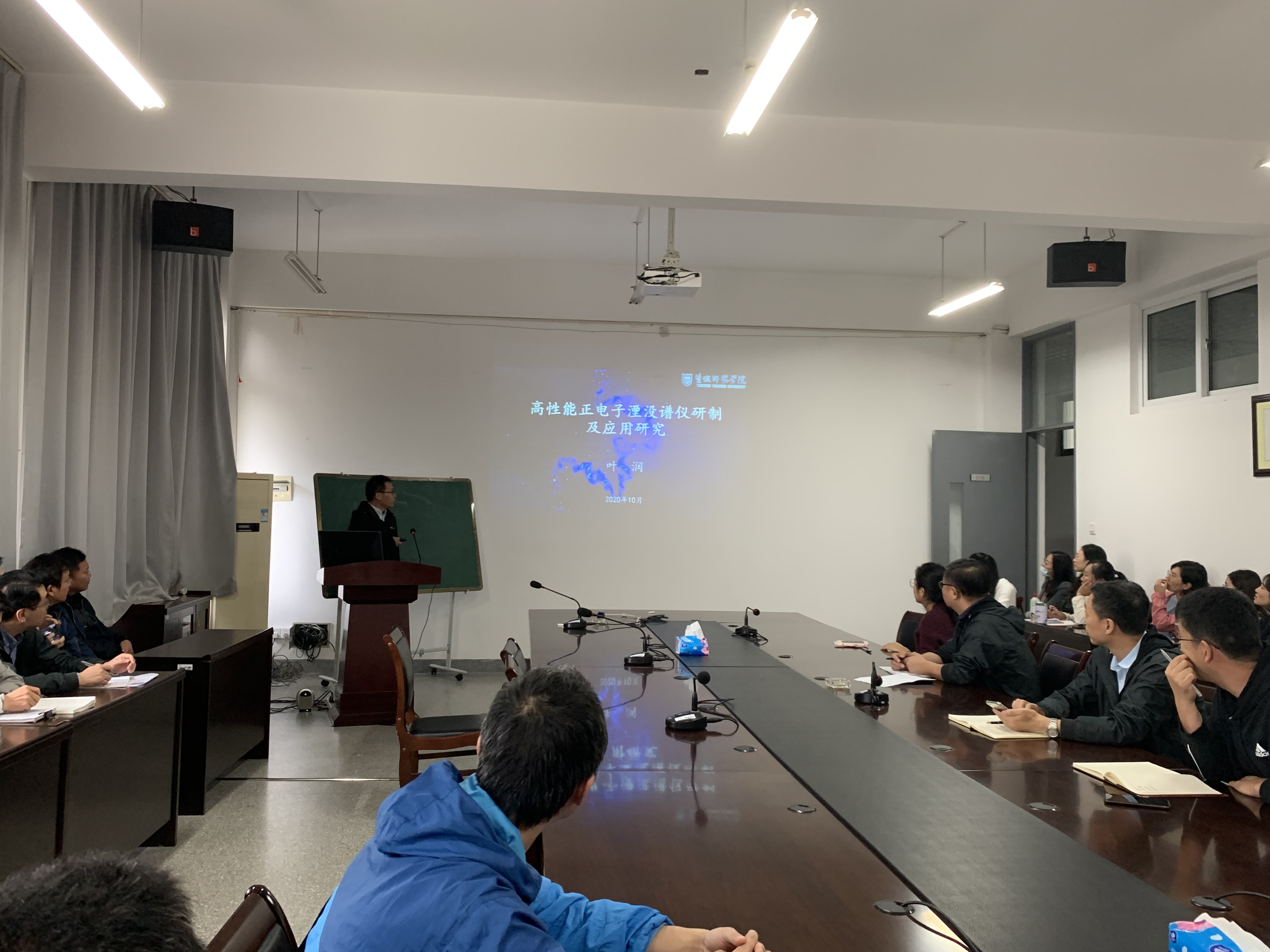 叶润老师激情澎湃的演讲了高性能正电子湮没谱仪研制及应用研究。详细介绍了用正电子湮没谱学的各种测试手段的基本原理及其应用,并就研制一台高时间分辨率的正电子湮没寿命谱仪进行了深入探讨和详细阐述。最后的试验结果表明,采用BaF2闪烁体当探测器的晶体,将晶体切割成圆柱形,大光电倍增管选用日本滨松产的型号为R2059的管子,采小选用聚四氟乙烯当封装晶体的材料,用伞状封装方式封装晶体,使用光电倍增管推荐的分压比焊接负高压式分压电路,这样研制出来的探测器上升时间约为2.5ns。