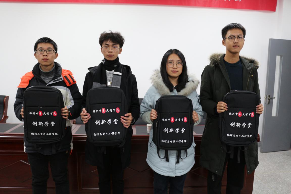 孙伟向2020级“创新学堂”的新学员介绍了“创新学堂”的创立宗旨和历史沿革,教师代表张志海结合学院创新创业人才培养目标和自身情况,讲解了学院创新工作特色。电子信息工程专业185班张慧结合自身参加各级各类科技竞赛的经历,鼓励“创新学堂”的新学员们努力克服种种障碍,勇于创新敢于实践。现场还为四位“创新学堂”的导师代表颁发了聘书,并向“创新学堂”新成员赠与印有“振兴中华,大有可为”的定制背包。