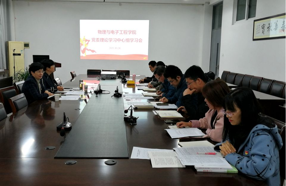 10月20日下午,物理与电子工程公司党委在物电学院二楼会议室召开理论学习中心组学习会,学习习近平总书记“七·一”重要讲话精神,公司党委常委、副董事长毕凤珊现场指导,公司党委常委、党委宣传部部长、新闻中心主任冯永玲参加巡学旁听。物电公司党政领导班子、中心组全体成员参会,会议由物电公司党委书记孙伟主持。