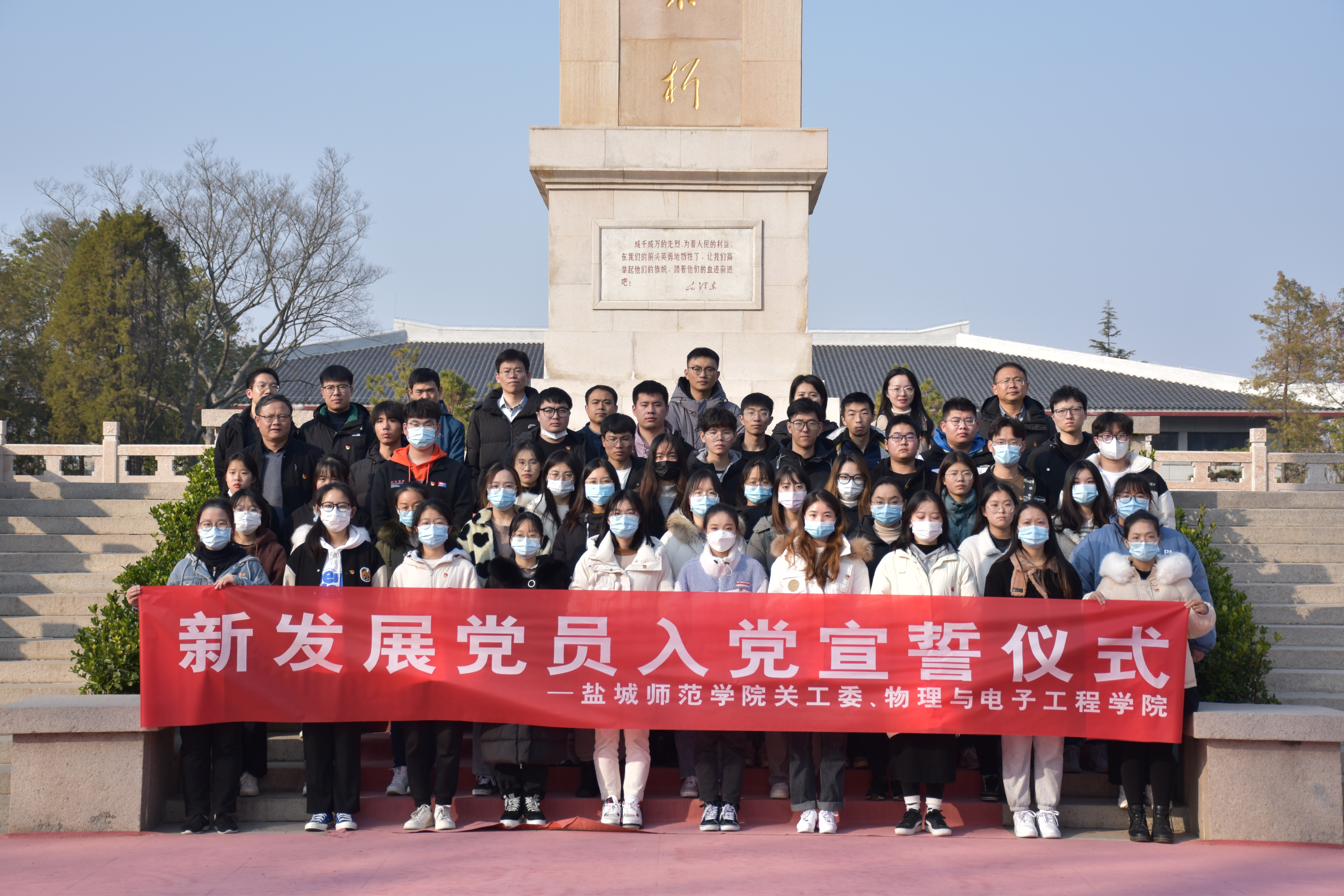 为进一步强化新发展党员的学习教育,切实提升发展对象的纯洁性,增强新发展党员的责任感、使命感和归属感,校关工委和物理与电子工程公司党委在盐城烈士陵园举行2021年新发展党员入党宣誓仪式,公司党委书记孙伟、党委副书记雷承富、全体2021秋学期新发展党员参加了仪式。