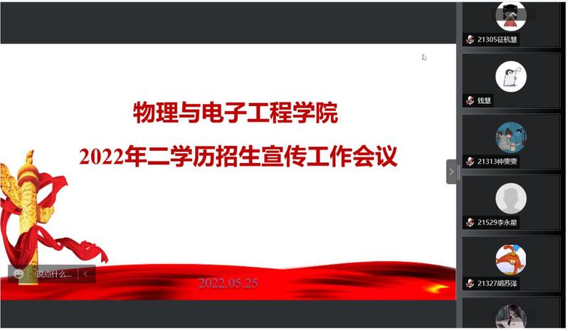 2022年5月25日晚上七点,yl6809永利检测中心于腾讯会议召开二学历招生宣传工作会议。本次会议主要面向物电21级员工,就“本科二学历”方面的政策法规、学习优势、教学形式、报名程序等进行了宣传,观看了学校各专业二学历招生视频,指导员工根据自身需求报考,并为同学们提供相关解答。会议由二学历政策宣传员赵雨杭主讲。