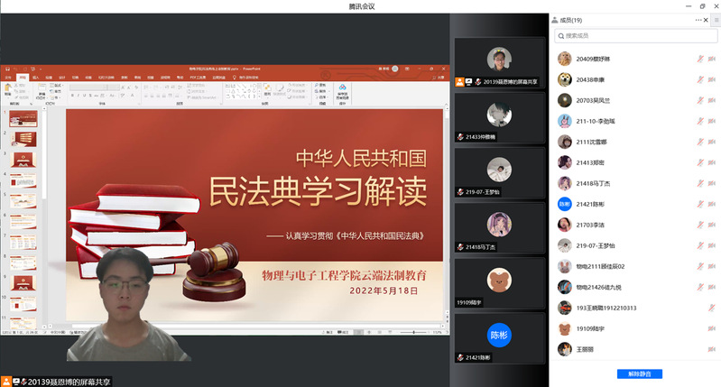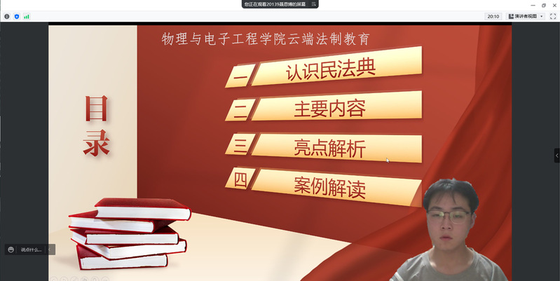 物电学院组织师生参与线上民法典宣讲活动,在法典宣传员聂恩博的讲解下,师生进一步了解民法典,通过案例分析,引导师生学会使用民法典,讲好民法典故事、传播民法典知识、阐释民法典精神。