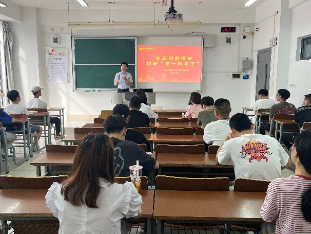 为进一步强化老员工法纪意识和廉洁意识,促进老员工学法、懂法、守法,筑牢思想防线。5月27日下午,校纪委党纪法规学习教育宣讲团成员、副科级纪检监察员吴帅在综合楼B306为学院员工党员做“知纪明规懂法,扣好‘第一粒扣子’”专题宣讲,物电学院辅导员陈成主持。