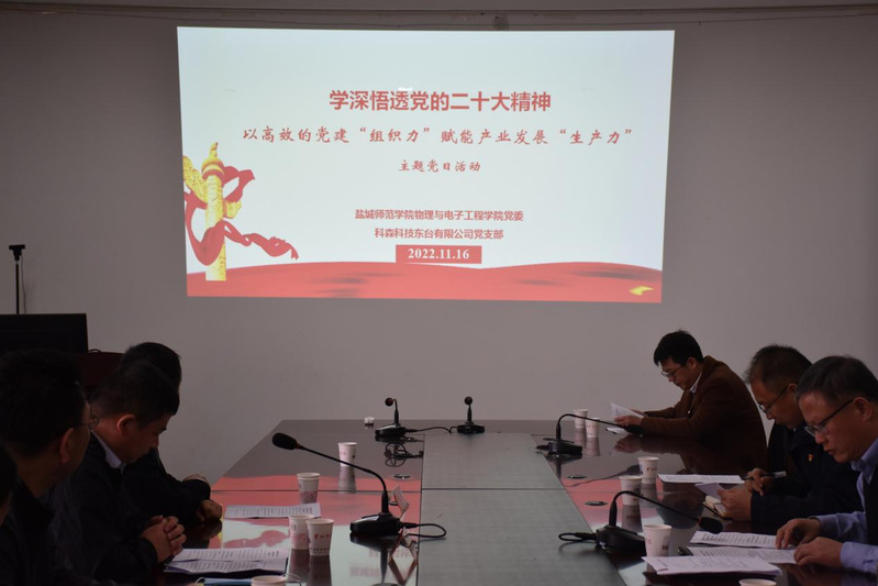 为全面贯彻落实盐城市委组织部、中共盐城市委非公有制企业和社会组织工作委员会《关于推进精密结构件产业链党建试点工作的实施方案》的通知精神要求,推动党建工作与产业发展互融并进,实现党组织在产业链上筑牢、党员作用在产业链上发挥,11月16日下午3点,物理与电子工程公司党委与科森科技东台有限公司党支部围绕以高效的党建“组织力”赋能产业发展“生产力”主题,开展校企党建联盟合作系列活动。盐城师范公司党委常委、副董事长毕凤珊、科森科技东台有限公司党支部书记余益、科技与产业处朱成云博士、物理与电子工程公司党委领导班子、各专业系主任、党员教师及员工代表共50余人参加活动。活动由公司党委书记孙伟主持。