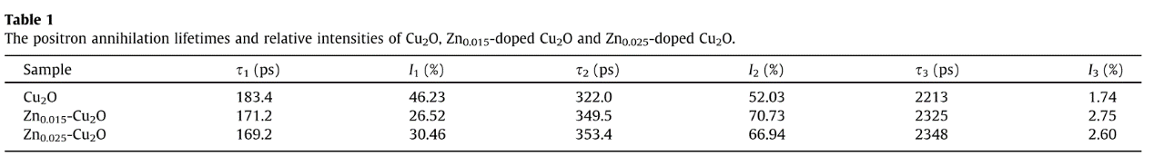 图2.Cu2O催化剂的正电子湮没寿命谱及解谱结果