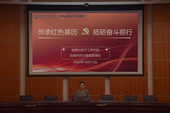 本次报告会邀请了全国优秀讲解员、盐城金牌讲解员、盐城青年讲师团成员、盐城市革命烈士陵园管理处朱熙锺作为主讲人,她以盐城的“天蓝”、“地绿”、“基因红”三个方面为切入点,与新生们分享了盐城的红色故事。“天蓝”象征红旗飘扬,象征着盐城人民的信仰和追求;“地绿”指的是盐城独特的自然环境,与人民为共生发展的理念紧密相连;“基因红”则是指盐城源远流长的红色基因,代代相传。