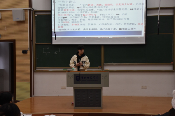郑凯铭同学从教学过程的开头、结尾、衔接三个方面展开讲解,结合诸多实例,让同学们真切地感受到不同的教学方式带来不同的教学效果,强调了教学设计、课件制作等方面的要点。同时,也向同学们分享了自己在备赛过程中曾遇到的问题,并提出了宝贵的建议。