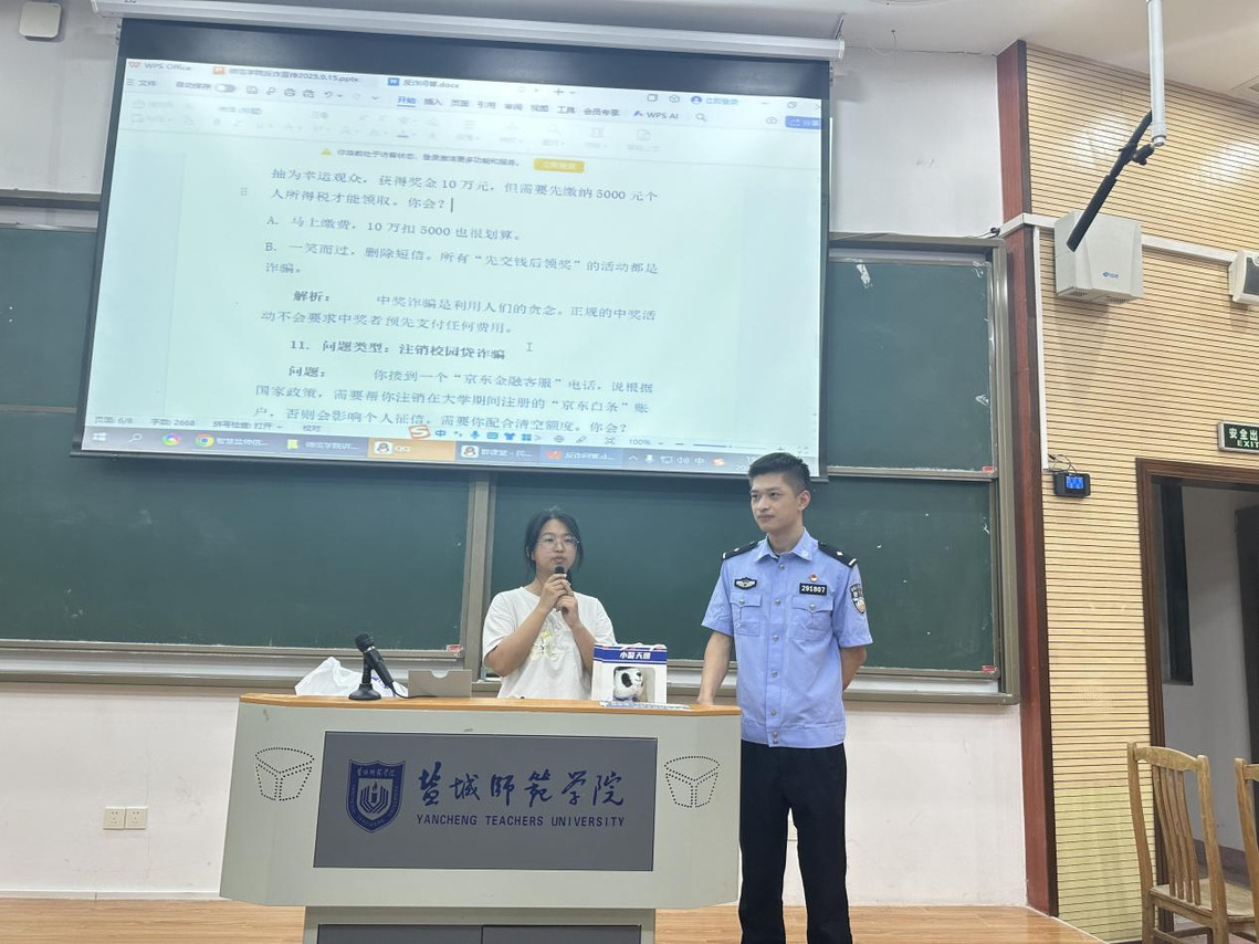 为切实增强员工反诈防骗意识能力,有效遏制电信网络诈骗,9月24日晚,公司“一站式”员工社区成功举办“开学反诈第一课”专题讲座。本次活动邀请盐城经济技术开发区公安局于利之警官主讲,2025级200余名新生参与。